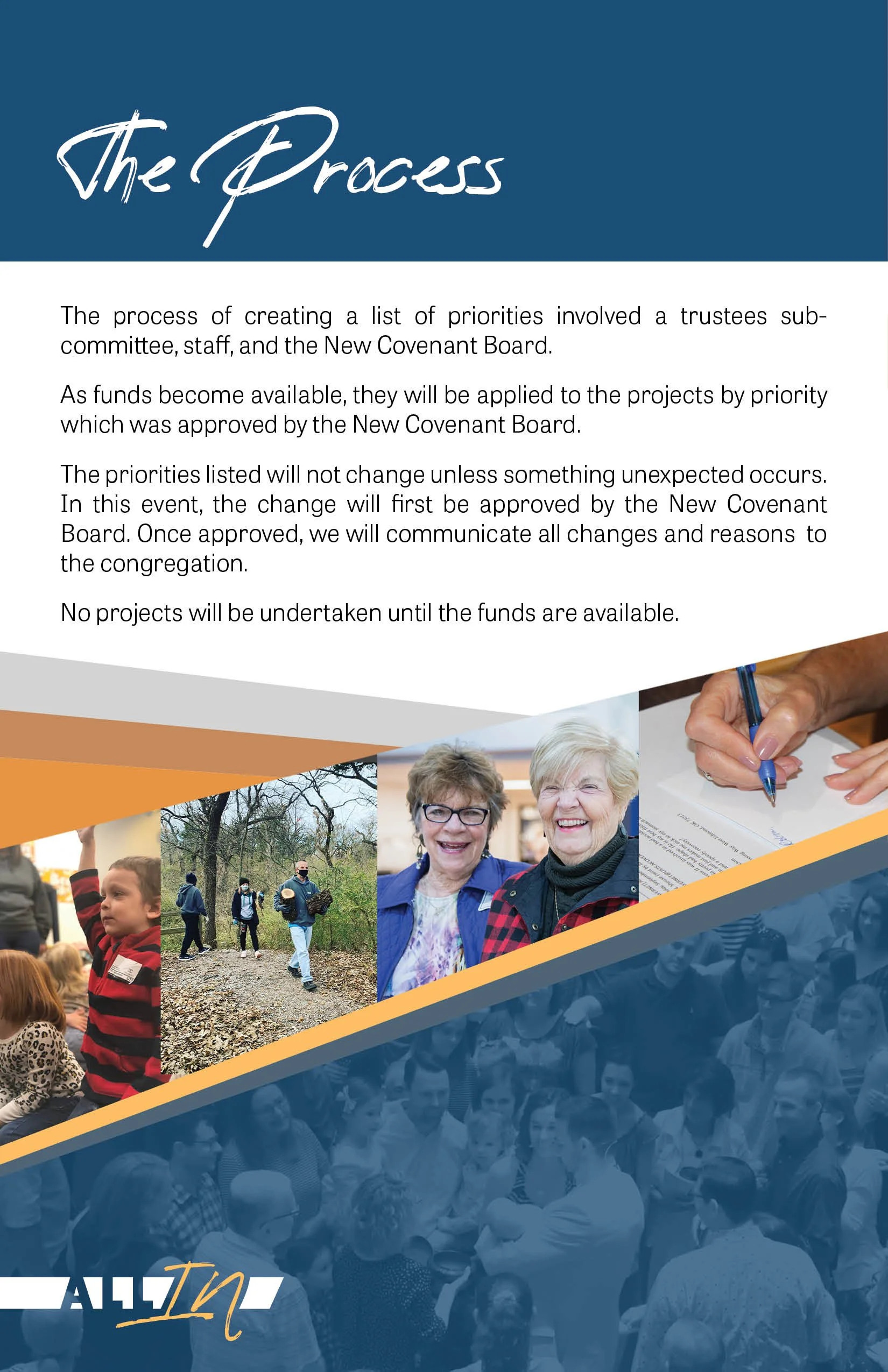 The priorities listed will not change unless something unexpected occurs. In this event, the change will first be approved by the New Covenant Board. Once approved, we will communicate all changes and reasons to the congregation.