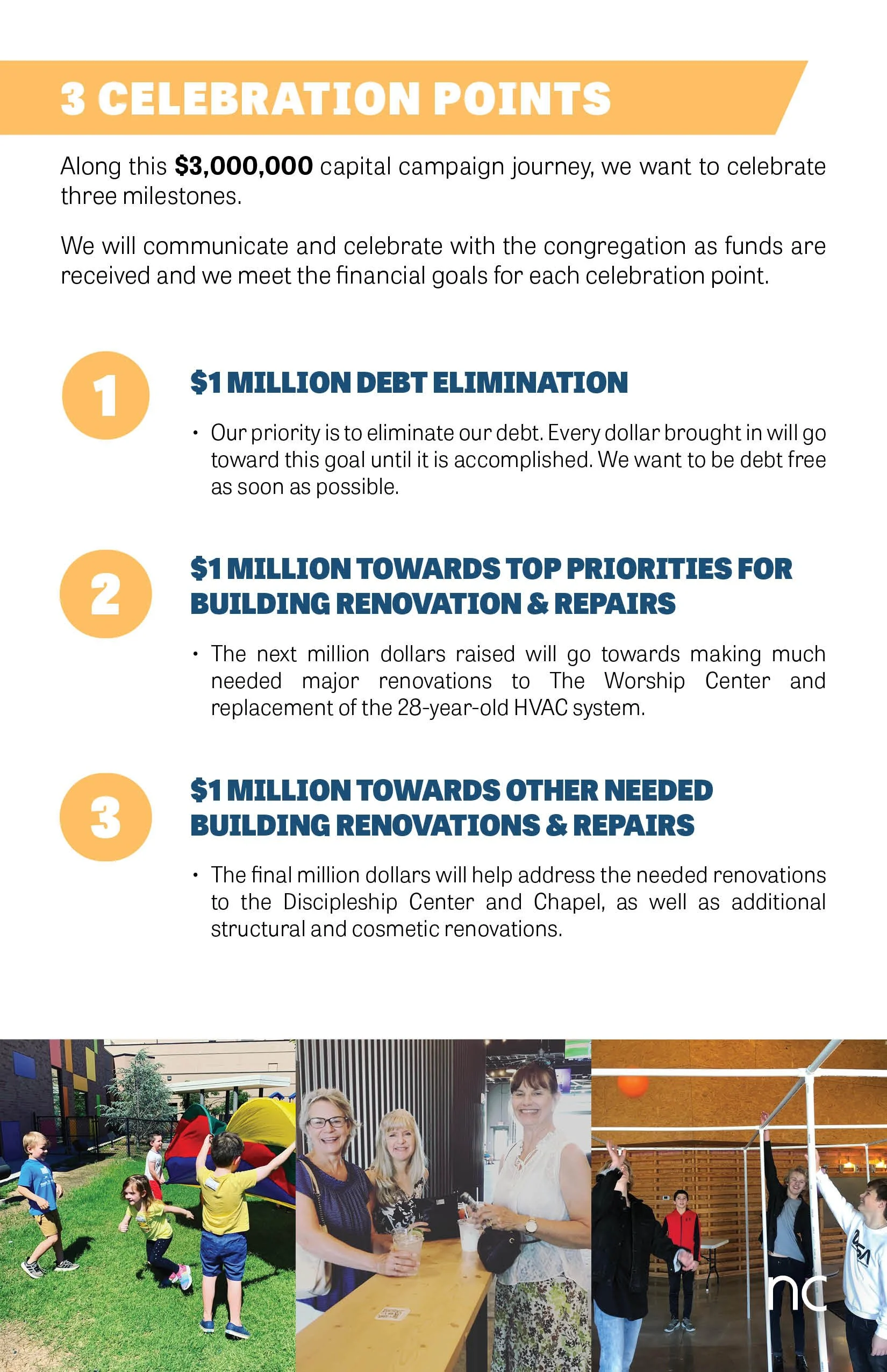 The next million dollars raised will go towards making much needed major renovations to The Worship Center and replacement of the 28-year-old HVAC system.