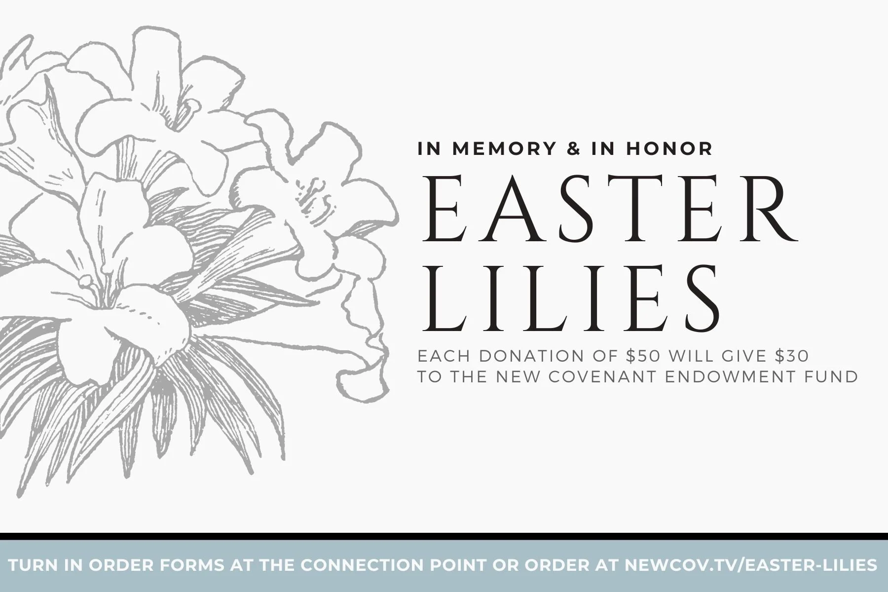 You can purchase an Easter Lily in honor or memory of a loved one or friend this Lent season. Each $50 gift will include $30 of your purchase going towards the New Covenant Endowment; a gift that will keep on giving for many years to come. The deadline to order is Sunday, March 29th.