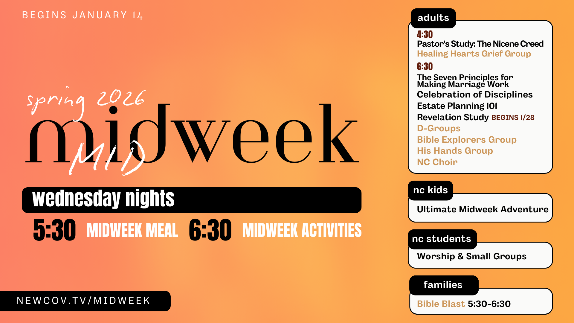 NC Students will meet weekly in the NC Commons and NC Kids will have Ultimate Midweek Adventure in the Kids Building at 6:30pm.