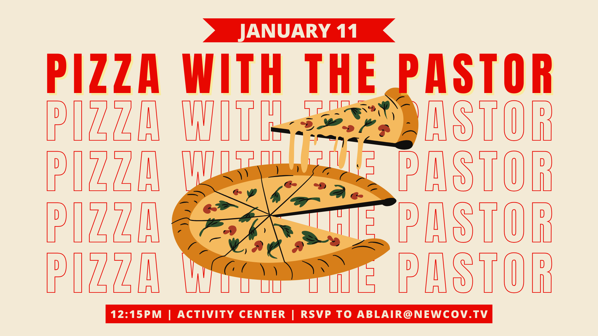 If you have been visiting New Covenant, please join us for Pizza With the Pastor, on January 11th, following the 11:00 am services, in the Activity Center. This is a great time to meet our pastor and some of our staff members. Kids are welcome and there will be plenty of pizza to go around. Email ablair@newcov.tv to RSVP!