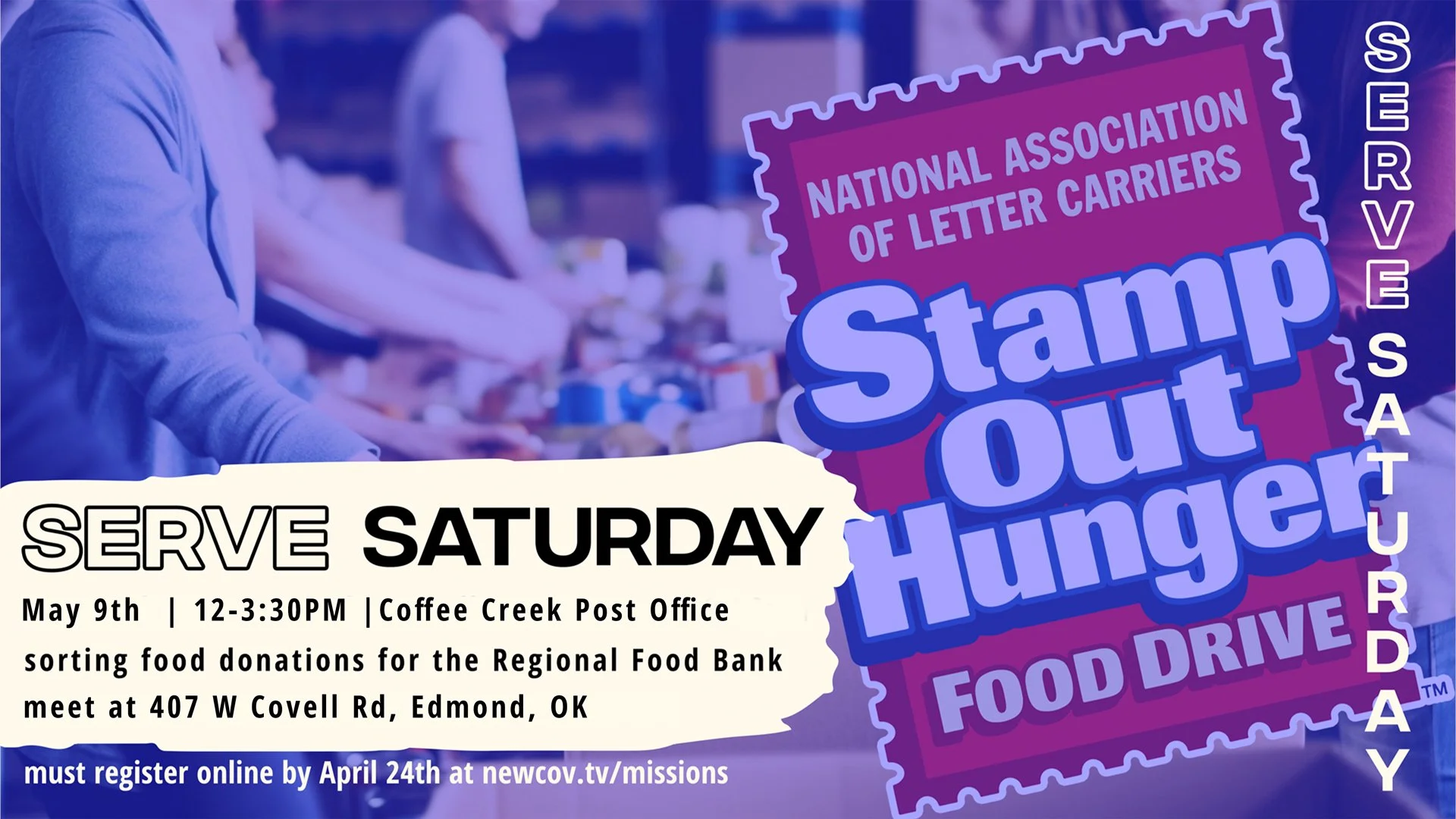 Sign up to volunteer at our May Serve Saturday where we will help Stamp Out Hunger! We will be sorting food collections for the Regional Food Bank of Oklahoma at a local post office, Edmond Coffee Creek Post Office, 407 W Covell Rd, Edmond, OK 73003.